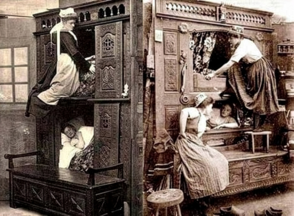 What I consider the peak of canopy bed functionality is a box bed. Yes, an actual wooden box with doors that you get into. Not anymore an object of high status, but a purely utilitarian middle class invention for winters in the cold climate where proper heating is unavailable or unaffordable. And sometimes these were bunk beds too! I like to see them as early prototypes of nowadays capsule hotels and future goo pods.