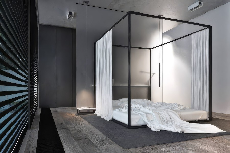 I imagine a loft where there are no separate rooms, possibly with windows not covered by heavy curtains. A large minimalistic space which, even though pleasing to the eye, will lack coziness. And then a simple canopy bed with some sheer tulle will help feel more private and sleep better. This may also be a fully open space like some Bali nature living with no glass windows at all where saving oneself from mosquitos, and lizards, and other small forms of life crawling throughout would be an absolute necessity.