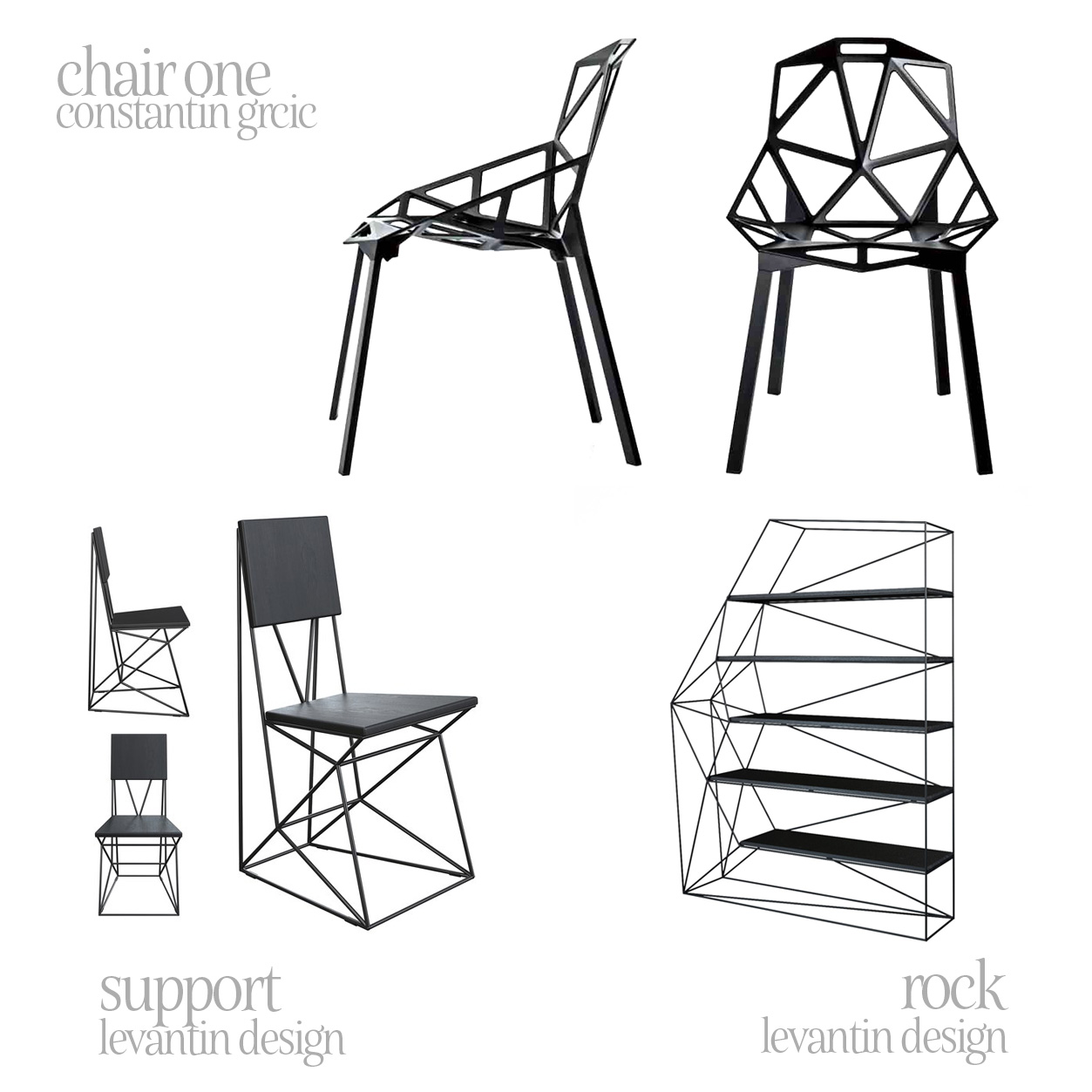 Even though it's considered that Chair One design is inspired by the structure of a camping chair but its geometric and angular design brings polygons to my mind. Another example is Support chair by Levantin Design. And probably you've seen a lot of similar 3D paper puzzles or other décor items. Solid or composed of lines, in my mind they all originate from particular view options of 3D modelling software.