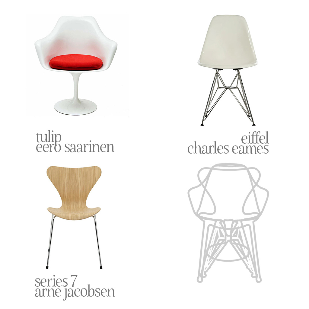 These three are "Series 7" by Arne Jacobsen, the "Tulip Armchair" by Eero Saarinen and the "Eiffel Chair" by Charles Eames, the three design masters. Some lines have been amplified slightly to create this distinct pagoda-like shape.