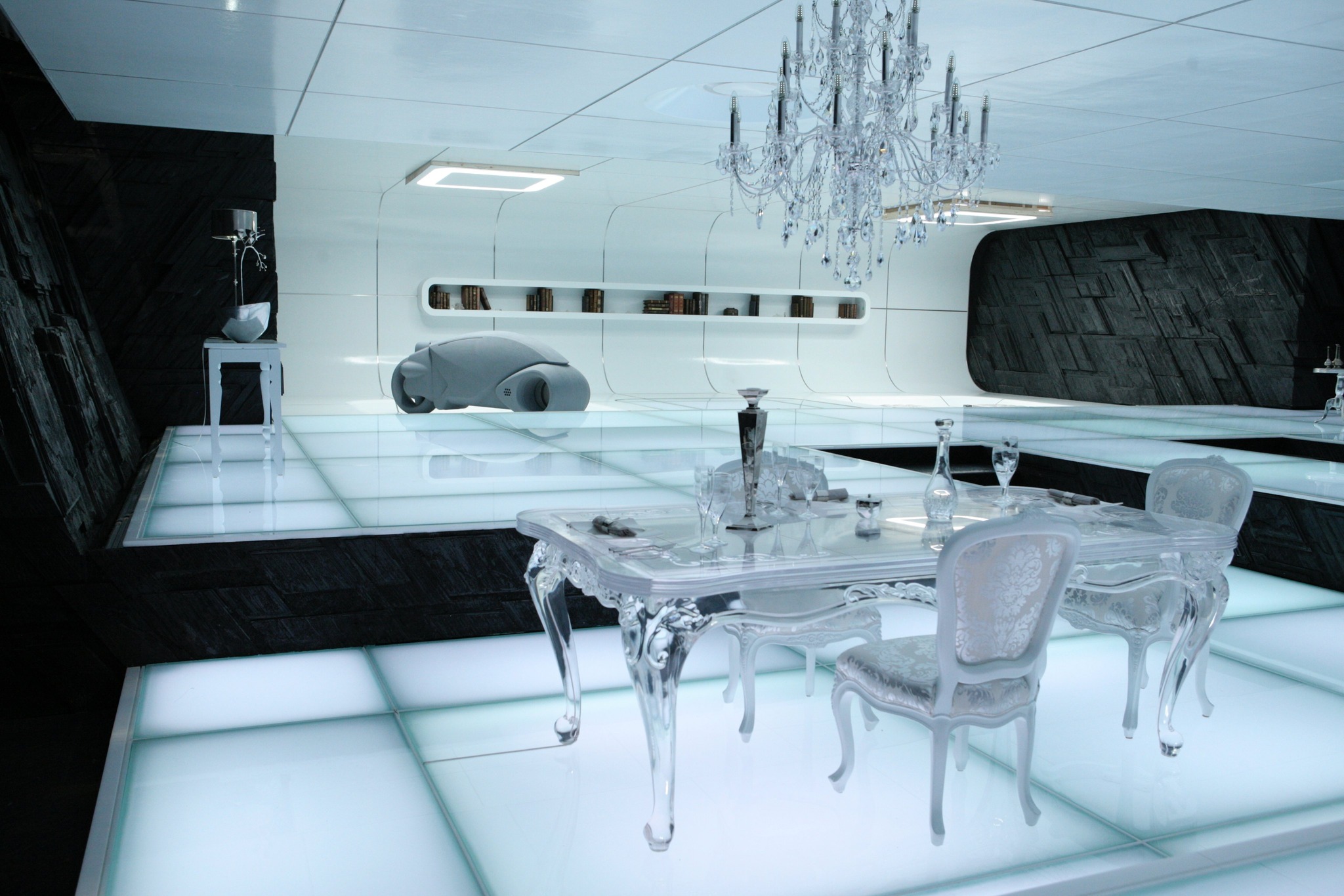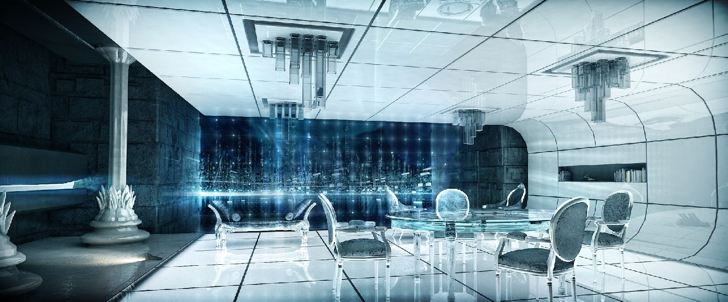 And today's eye candy is Tron Legacy hideout design. It continues the trend of what you can do with the idea of baroque. Truly, no gold makes wonders. Especially paired with transparent acrylic.