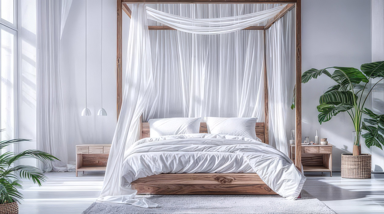 I imagine a loft where there are no separate rooms, possibly with windows not covered by heavy curtains. A large minimalistic space which, even though pleasing to the eye, will lack coziness. And then a simple canopy bed with some sheer tulle will help feel more private and sleep better. This may also be a fully open space like some Bali nature living with no glass windows at all where saving oneself from mosquitos, and lizards, and other small forms of life crawling throughout would be an absolute necessity.