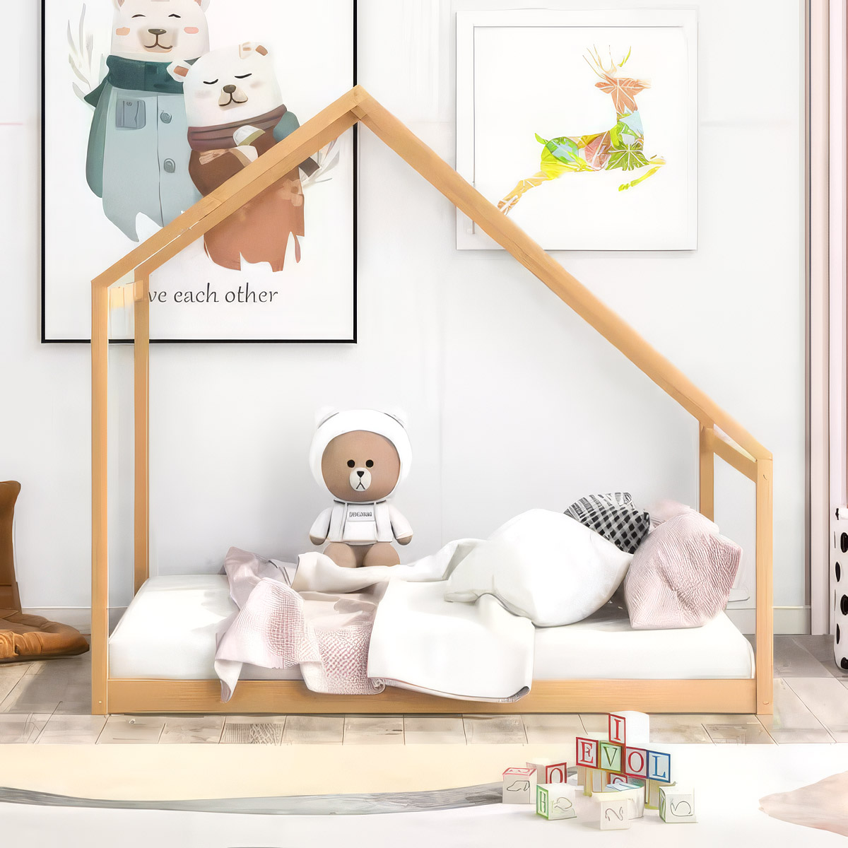 And at the end of the spectrum there are canopy beds which do not expect you to use any curtains at all. These are popular in kid's bedrooms where they are made to look like a tiny home, just like kids draw it on paper, a box with a triangle on top. These are nothing more than a shape, a quote, an idea of a box and ultimately — an idea of a home.