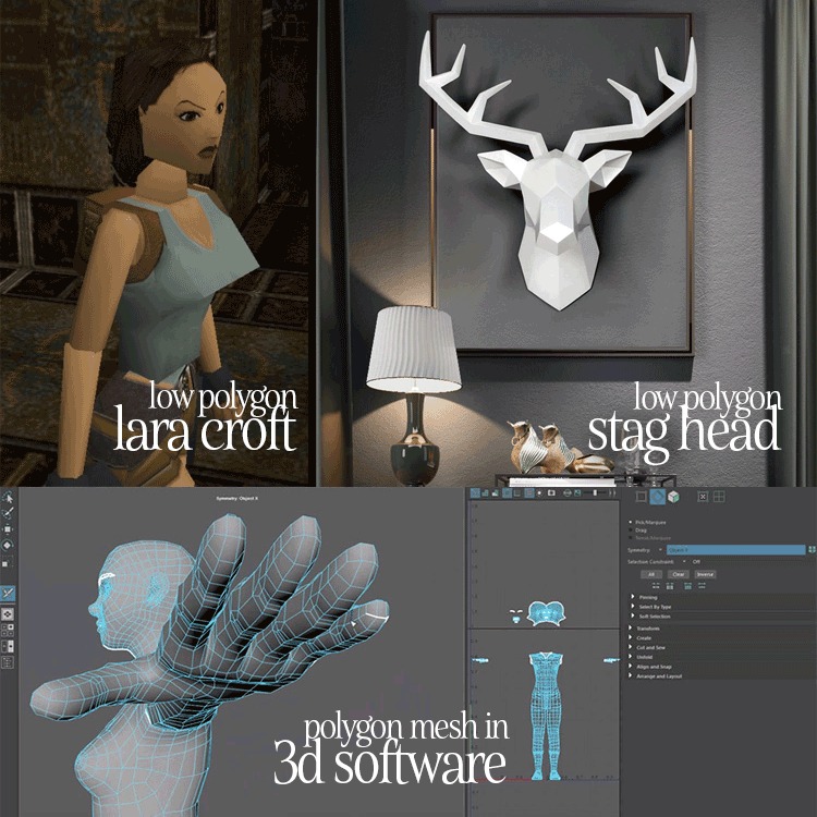 In 3D graphics, a polygon is a flat, two-dimensional shape used to represent a three-dimensional object. The surfaces of 3D models are made up of numerous polygons, triangles or quadrilaterals, which are arranged and connected to form a mesh. The vertices of these polygons are used to define the shape and surface of the object. The number of polygons used affects the level of detail and realism in the model, but higher counts can impact processing power. Low polygon 3D models were abundant in older computer games but not so anymore due to increased processing power.
