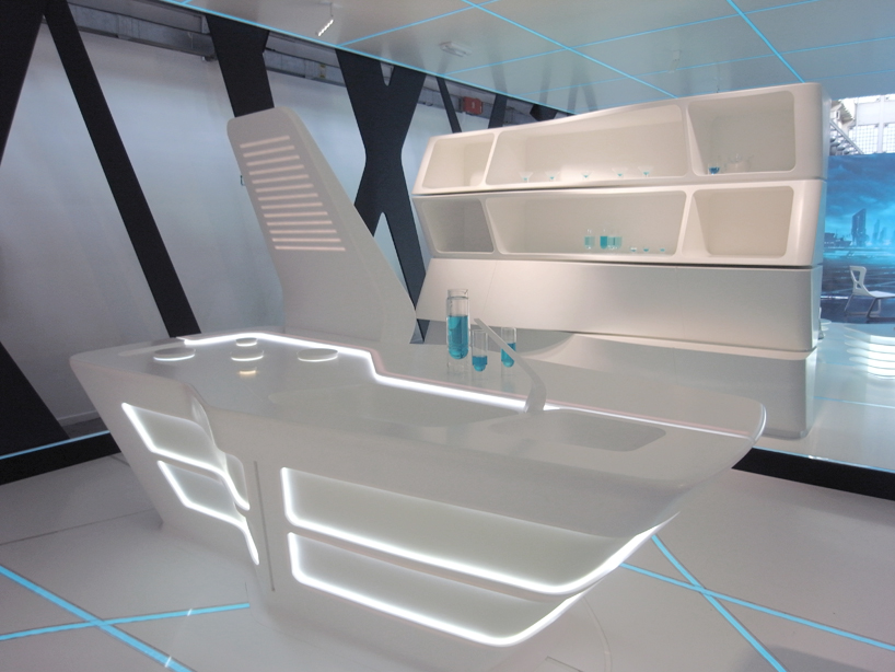 Shortly after the movie was released, Corian (a manufacturer of contemporary acrylic surfaces) made a collaboration with Disney to showcase an actually livable Tron interior design solutions. Though these are amazing I still like the movie sets better for the eclectic mix.