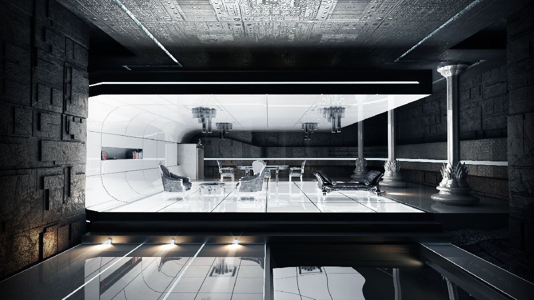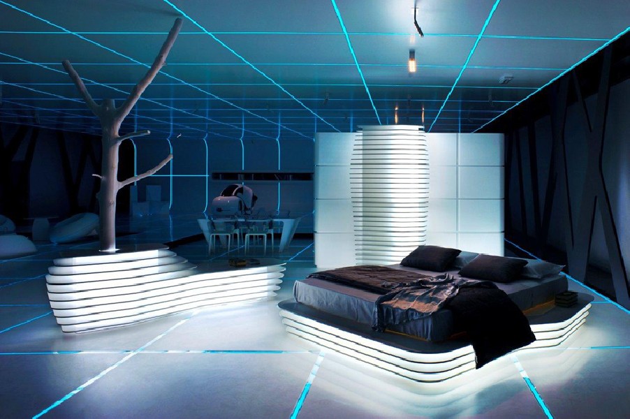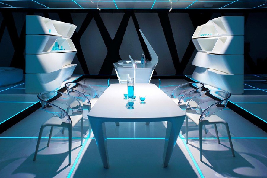 And today's eye candy is Tron Legacy hideout design. It continues the trend of what you can do with the idea of baroque. Truly, no gold makes wonders. Especially paired with transparent acrylic.